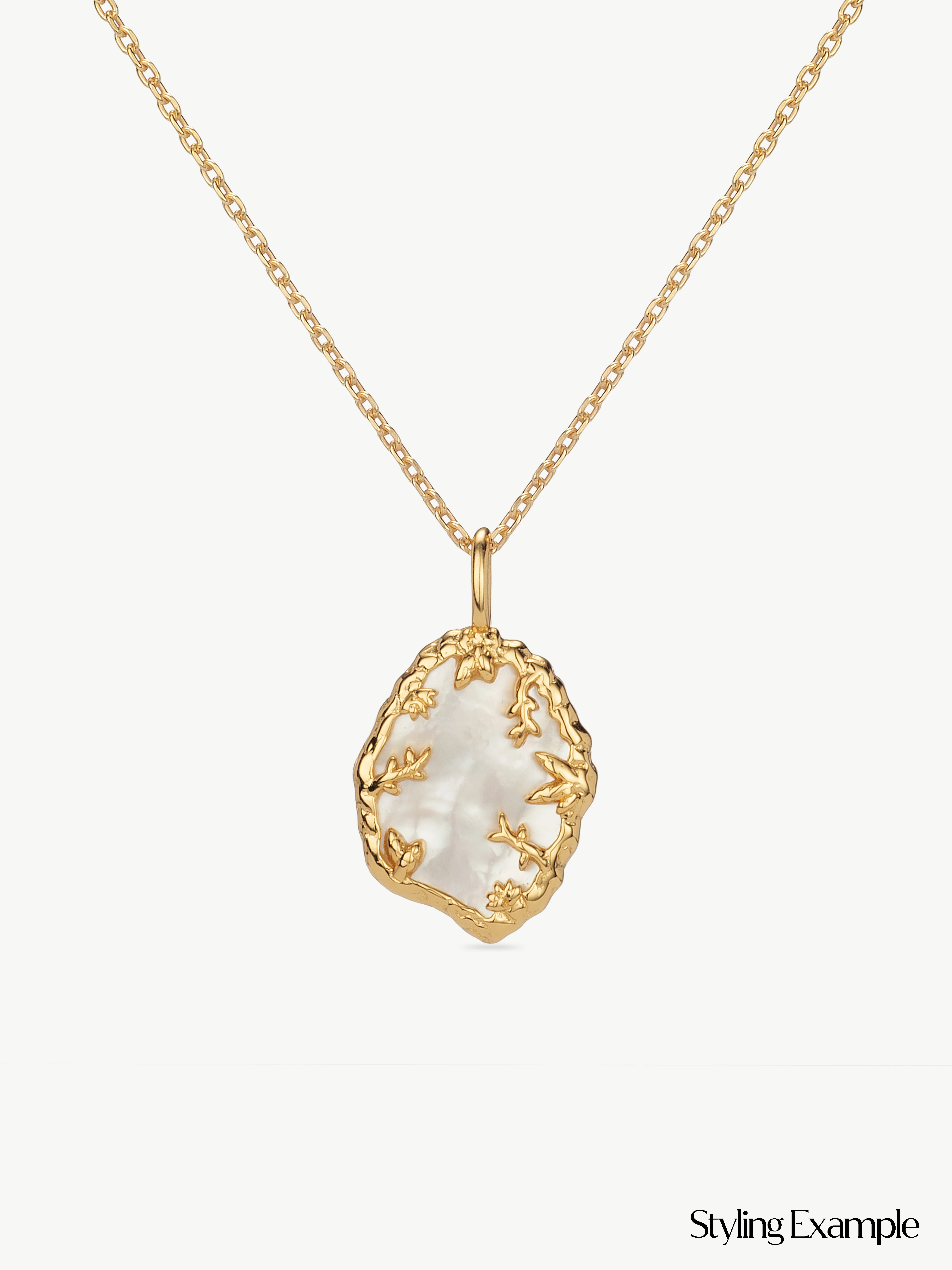 This pendant features a luminous mother-of-pearl centrepiece, delicately framed by an intricate leaf design. The iridescent surface of the mother of pearl catches the light with every movement, offering a subtle glow that shifts with your surroundings.