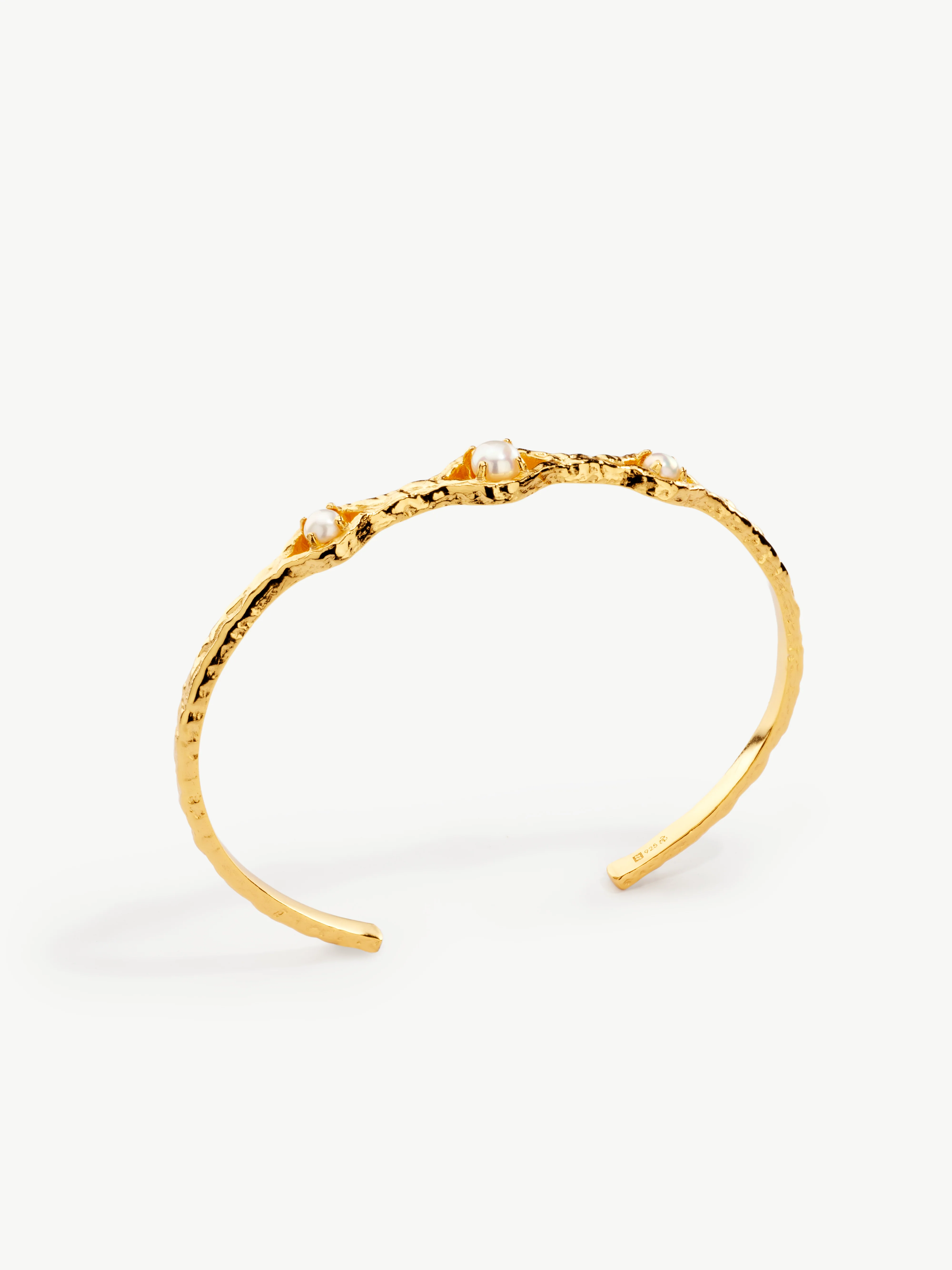 Crafted to inspire confidence and strength, this stunning molten statement bangle features a bold, textured design accented with three luminous Freshwater pearls. A striking balance of elegance and modern craftsmanship, it’s a timeless piece that commands attention—perfect for any occasion.