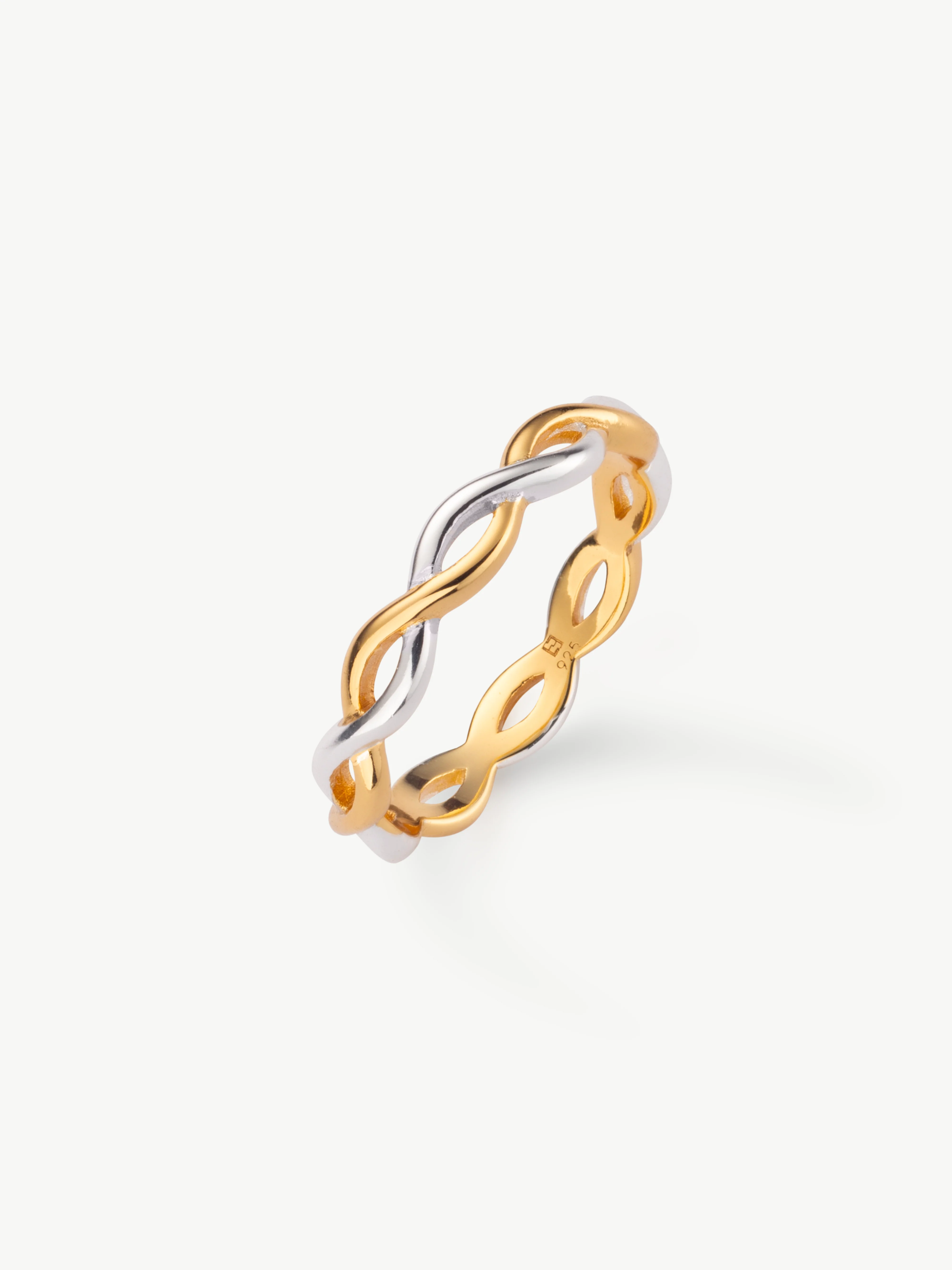 Beautifully crafted two-tone infinity ring with a unique twisted finish. A perfect fusion of gold and silver for a truly versatile piece. A great introduction to mixing metals.